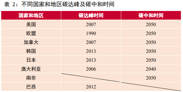 歐盟成員國中,德國率先啟動退核電計劃,預(yù)計2022年完成國內(nèi)剩余核電設(shè)施拆除計劃,2030年完成去煤化進(jìn)程,完成清潔能源轉(zhuǎn)型策略,其國內(nèi)大型碳咨詢企業(yè)萊茵國際儼然已成為行業(yè)內(nèi)標(biāo)桿型企業(yè),而其他國家的碳達(dá)峰碳中和時間表也在穩(wěn)步推進(jìn)中,美國實(shí)現(xiàn)碳達(dá)峰的時間是2007年,實(shí)現(xiàn)碳中和的時間為2050年,歐盟實(shí)現(xiàn)碳達(dá)峰的時間為1990年,實(shí)現(xiàn)碳中和的時間為2050年,加拿大實(shí)現(xiàn)碳達(dá)峰的時間為2007年,實(shí)現(xiàn)碳中和的時間為2050年,韓國實(shí)現(xiàn)碳達(dá)峰的時間為2013年,實(shí)現(xiàn)碳中和的時間為2050年。日本、澳大利實(shí)現(xiàn)碳達(dá)峰和碳中和的時間分別為2013年和2050年、2006年和2040年,此外的南非實(shí)現(xiàn)碳中和的時間是2050年,巴西實(shí)現(xiàn)碳達(dá)峰的時間為2012年。除此之外,我國計劃在2030年實(shí)現(xiàn)碳達(dá)峰,約比歐盟實(shí)現(xiàn)碳達(dá)峰晚約40年,比美國晚約23年,比日韓晚約17年,之后,我國計劃在2060年實(shí)現(xiàn)碳中和,僅比發(fā)達(dá)經(jīng)濟(jì)體實(shí)現(xiàn)碳中和晚約10年。