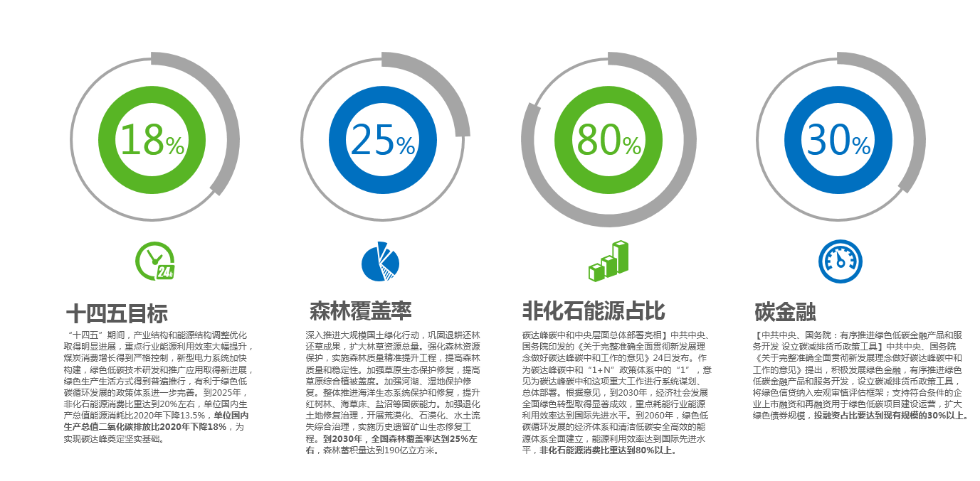 “十四五”期間,產(chǎn)業(yè)結(jié)構(gòu)和能源結(jié)構(gòu)調(diào)整優(yōu)化取得明顯進(jìn)展,重點(diǎn)行業(yè)能源利用效率大幅提升,煤炭消費(fèi)增長得到嚴(yán)格控制,新型電力系統(tǒng)加快構(gòu)建,綠色低碳技術(shù)研發(fā)和推廣應(yīng)用取得新進(jìn)展,綠色生產(chǎn)生活方式得到普遍推行,有利于綠色低碳循環(huán)發(fā)展的政策體系進(jìn)一步完善。到2025年,非化石能源消費(fèi)比重達(dá)到20%左右,單位國內(nèi)生產(chǎn)總值能源消耗比2020年下降13.5%,單位國內(nèi)生產(chǎn)總值二氧化碳排放比2020年下降18%,為實(shí)現(xiàn)碳達(dá)峰奠定堅(jiān)實(shí)基礎(chǔ)。